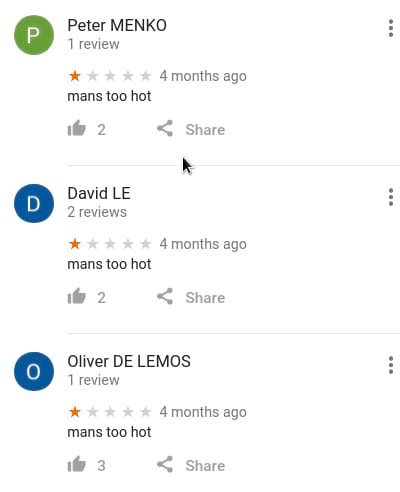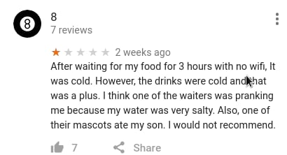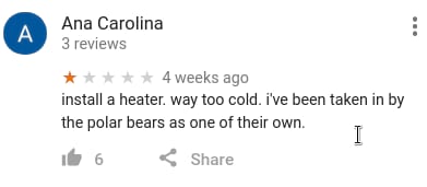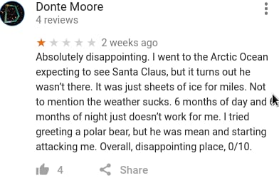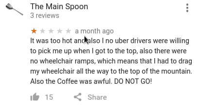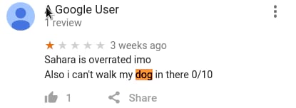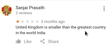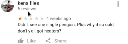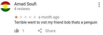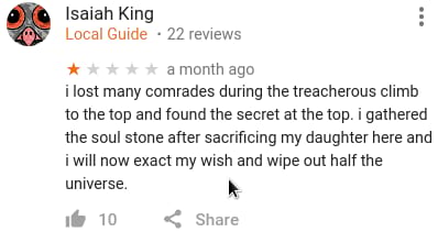事件起因是这样的,今天无聊看到下面这张图然后我才意识到,在Google地图上你是可以对一般意义上的地理位置(而不是我以前以为的POI)打分的, 于是简直像打开新世界大门一样,我立刻去了解了一下各个地方的打分和评论,不出意外的已经被 各种奇技淫巧的吐槽星人们花式占领了—.—||。。